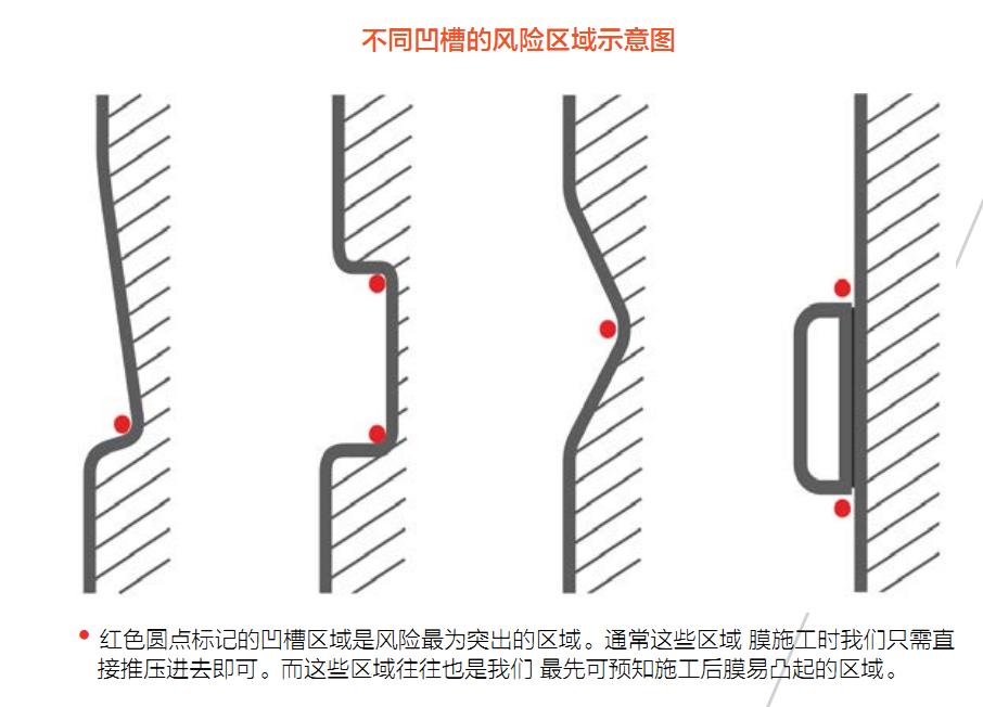 风险区域是指这些表面施工容易产生风险,当膜贴合后容易凸起或 是不易施工成功的区域 。这些区域包括我们常说的凹槽和坡口区 域. 这些区域时间久了后车膜容易翘起或是凸起,在表面看起来则 像是气泡一样的鼓起。