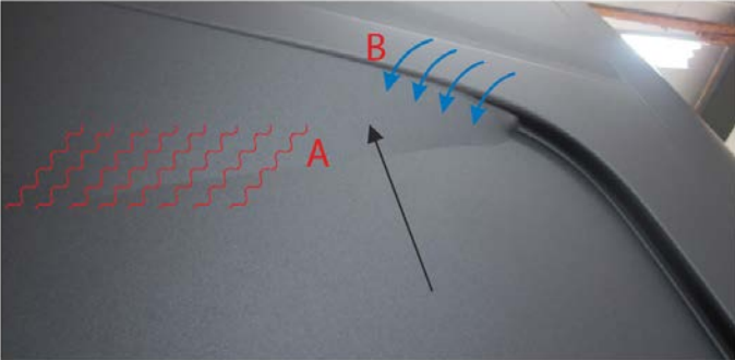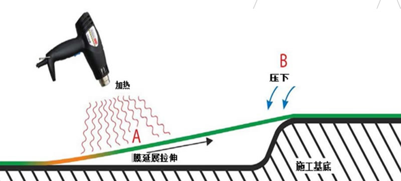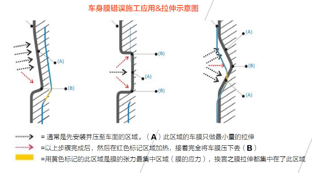 施工时加热处在平坦面而没有张力的区域的薄膜(如以下A所示区域) 这个区域车膜可以进行拉伸延展,从而避开任何其他的坡口和凹槽区域的拉伸延展,上端未延展的车膜则可以均衡的向坡口凹槽区域压下(如图B所示)。 如有必要,再次加热A区域的车膜并再次压下B区域所示的车膜直至此凹槽坡口处车膜的贴合包覆。然后,用刮板迅速并坚实的将车膜压到坡口中,确保车膜在坡口中的完全贴合。与此同时也需要用刮板用力施压刮平A区域贴覆的车膜从而确保有效的施工。按照如上的工艺进行施工, 我们不难发现凹槽坡口处贴合的车膜完全没有任何的延展和拉伸,没有延展和拉伸,应力留存的坡口与凹槽区域的车膜是不会出现任何凸起和翘起的现象。