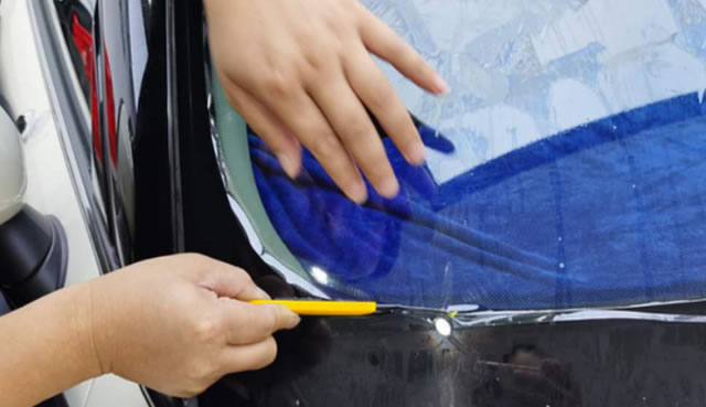 2、玻璃稍微摇下来点,用切纸机沿玻璃边缘切割,打开门,用水罐中的水和刮刀反复清洗十次,否则容易把脏东西带进去,容易起泡。清洁玻璃后,最后用刮刀刮干净。